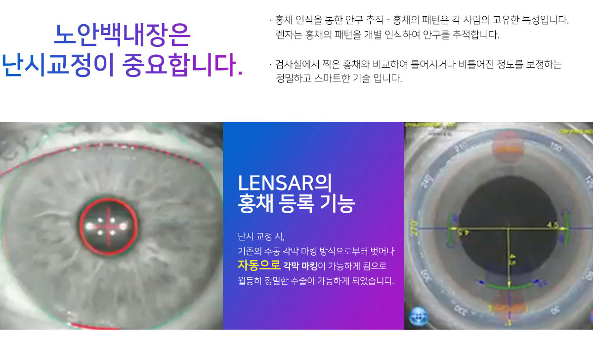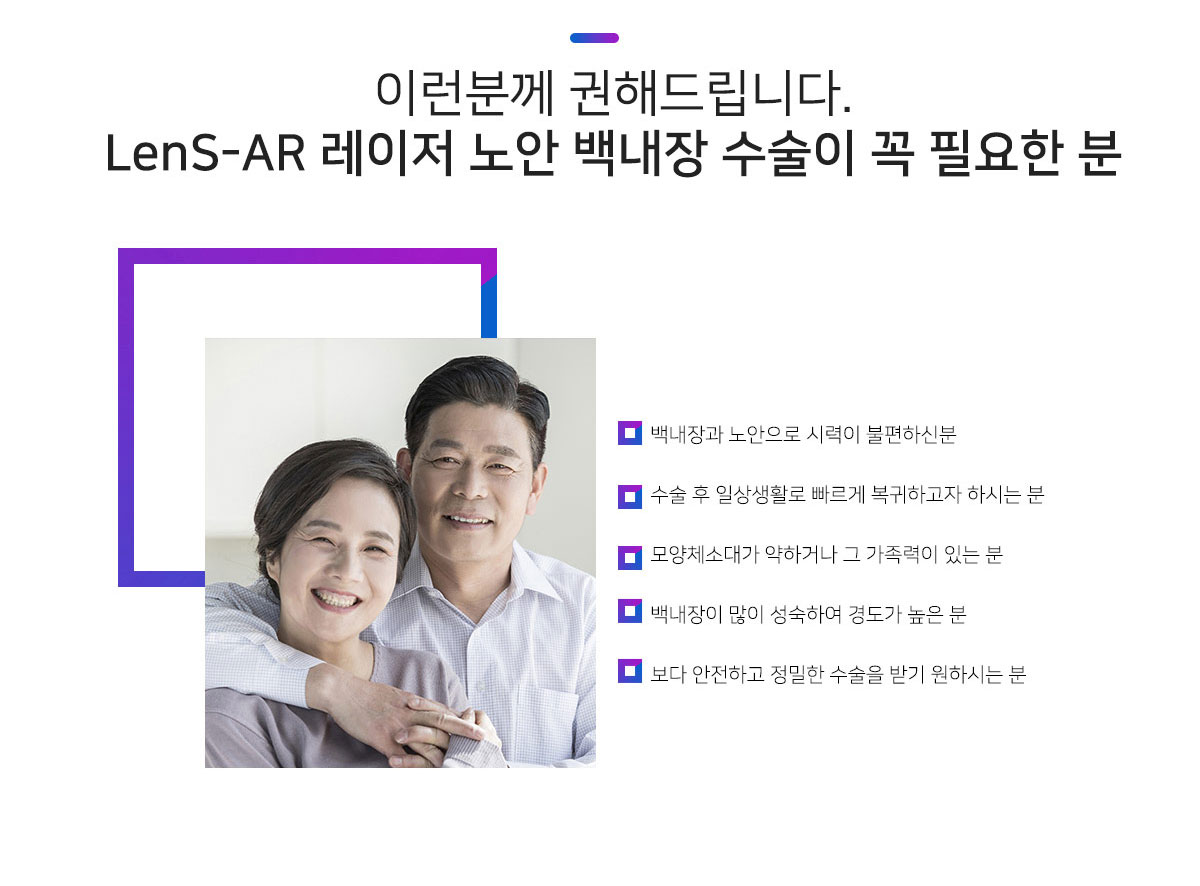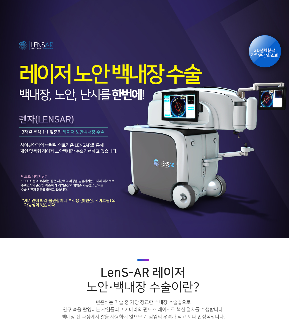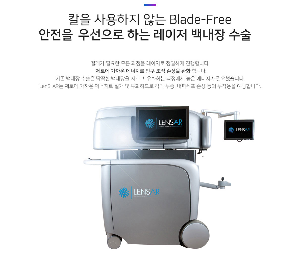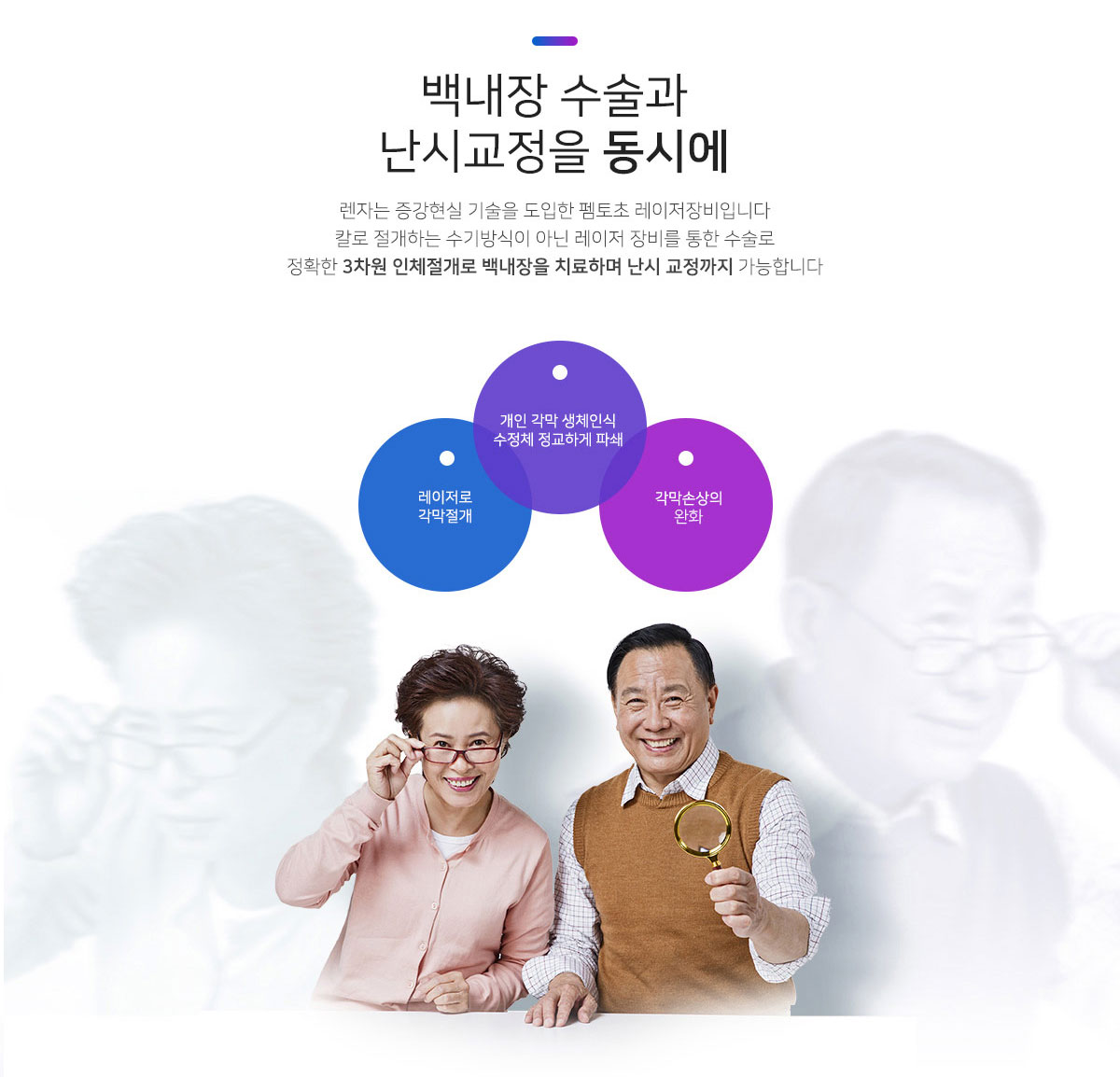 흐릿하고 뿌옇게 보이는 백내장 이란? 안전하고 믿을 수 있는 백내장 검사과정 LenS-AR 레이저 노안 백내장 수술 센추리온 노안 백내장 수술 다양한 인공수정체 백내장 인공수정체 꼭 지켜 주세요! 수술전, 주의 사항